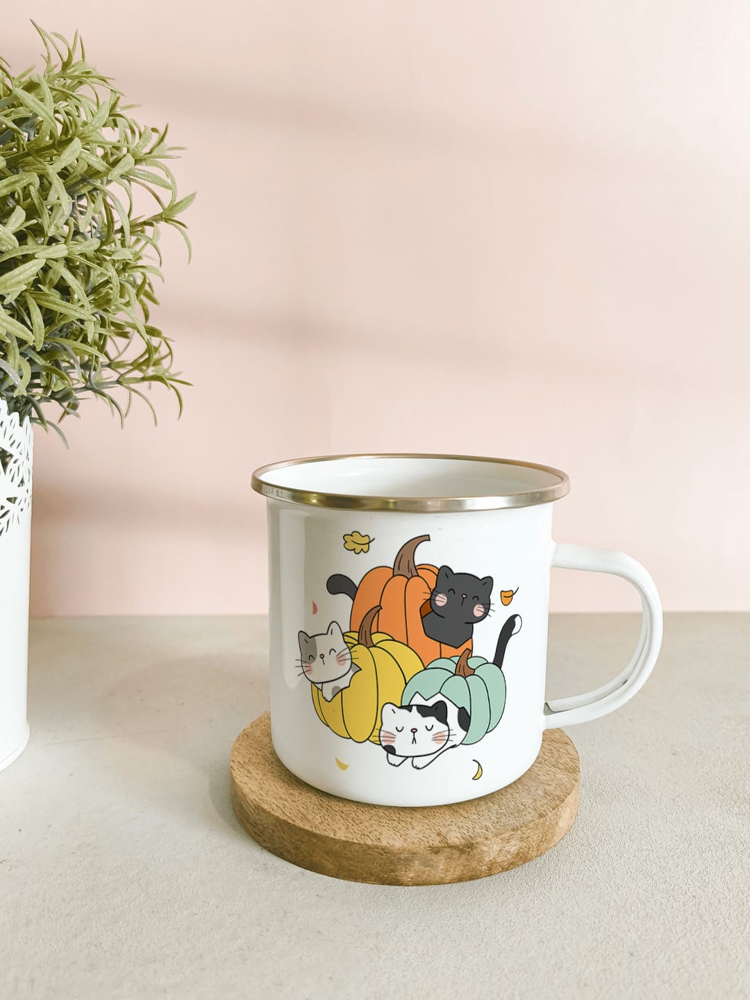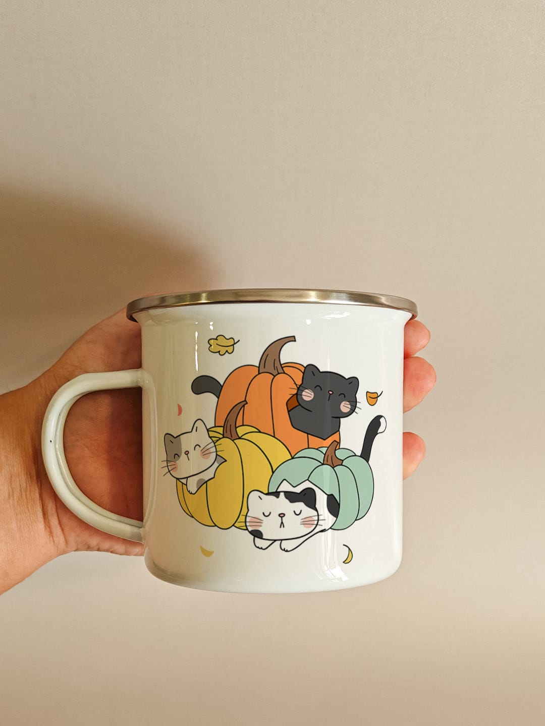 Printed personalised steel military mug – Cats & Pumpkins – our enamel-coated stainless steel military mugs, designed for durability and style! These mugs feature stunning, permanent prints that won’t peel off or fade, ensuring your favourite designs stay vibrant over time. Perfect for camping, outdoor adventures, or everyday use, they are also dishwasher safe for easy cleaning. Plus, they can be personalised, making them an ideal gift for friends, family, or fellow adventurers. Elevate your drinking experience with our resilient and beautifully designed mugs today!